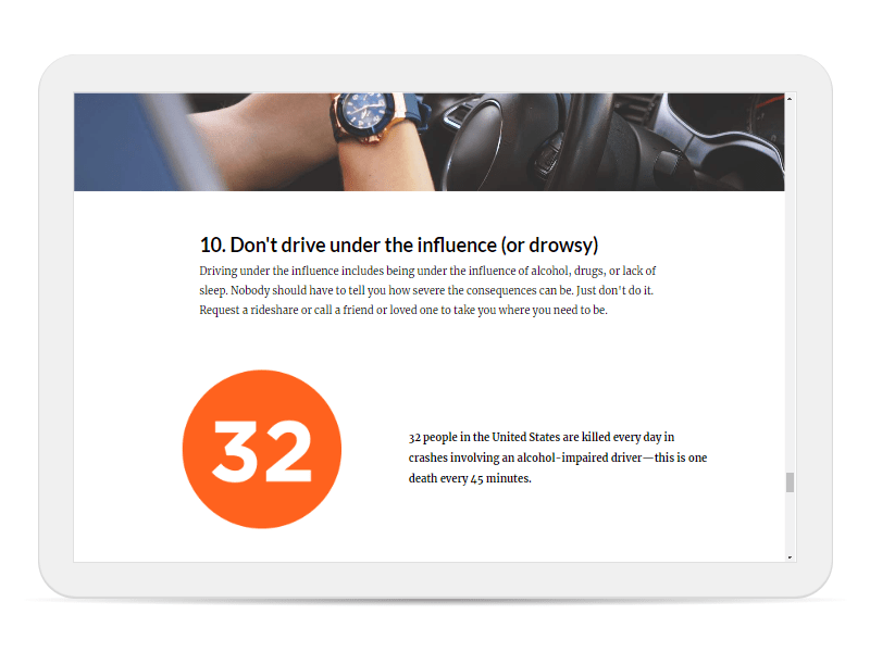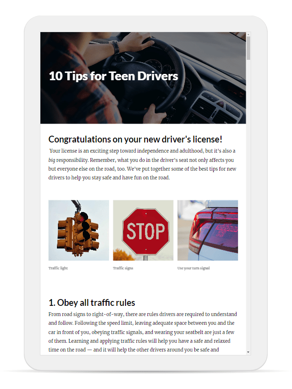 This is a sample microlearning module to demonstrate the capabilities of Articulate Rise 360. Microlearning is designed to be brief, easy to access, and mobile friendly. This course can easily be viewed on a phone or tablet. This demonstration module is built around ten tips for teen drivers. Rise content is displayed much like a traditional web page, with the learner scrolling down the page. As the learner scrolls, they view text, images, video, and interactive exercises. Articulate Rise is a great tool to develop training quickly and deploy it to your learning audience in a highly accessible format. Select View Demo below to launch the module.